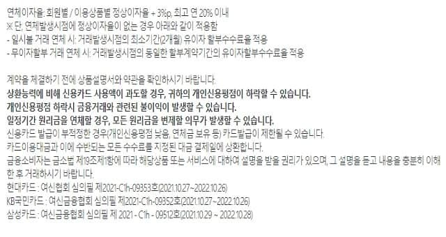 - 카드대출 : 현금서비스/ 카드론/ 리볼빙/결제대금 연기 및 분할납부, 일부업종 이용제한
