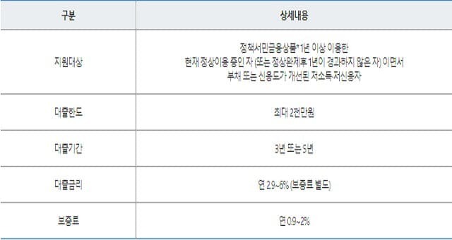 정책서민금융상품 (새희망홀씨, 미소금융, 근로자햇살론,사업자햇살론,햇살론15,햇살론 17, 바꿔드림론, 안전망대출, 안전망대출2, 햇살론유스) 1년 이상 이용한 사람한 현재 정상 이용중인자 또는 정상완제 후 1년이 경과하지 않은자 이면서 부채 또는 신용고가 개선 된 (부채 신용도 개선 ) 보증신청일 기준 최근 1년 가계 대출잔액감소 또는 신용평점 상승한 저소득저신용자 (소득요건) 연소득 3500만원 이하 신용평점 무관 또는 신용평점 하위 100분의 20에 해당하면서 연소득 4500만원 이하인자