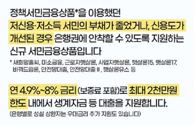 햇살론 뱅크는 정책서민금융상품을 이용하던 저소득 저신용자가 부채 또는 신용도 개선을 통해 은행권에 안착하게 하는 상품입니다.